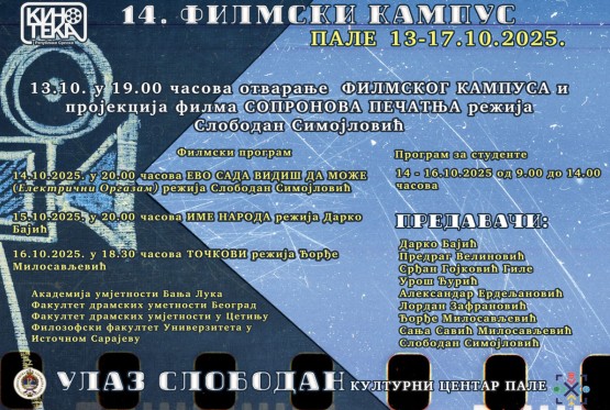 Ovogodišnji Filmski kampus, koji se održava po čet XIV put, predstavlja značajan događaj za studente Kinoteke Republike Srpske. Program će se odvijati od 13. do 17. oktobra u Kulturnom centru Pale, a cilj mu je obogaćivanje znanja i veština mladih…